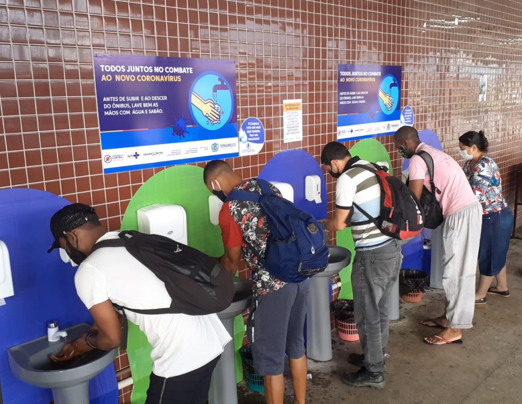 AÇÕES DE COMBATE À COVID – Na última semana, a Compesa lançou duas importantes ações sociais contemplando a população da Região Metropolitana do Recife (RMR). Em uma parceria com as secretarias estaduais de Desenvolvimento Urbano e Infraestrutura e Recursos Hídricos, a Companhia está instalando pias de higienização em 22 terminais integrados de passageiros. Até o momento, o total de 14 (Cajueiro Seco, Joana Bezerra, Prazeres, Aeroporto, Tancredo Neves, Recife, Barro, Pelópidas Silveira, Macaxeira, Caxangá, Getúlio Vargas, CDU, PE-15 e Xambá) já estão com as pias em pleno funcionamento e os demais (Camaragibe, Cosme Damião, Abreu e Lima, Igarassu, Cabo, Jaboatão, TIP, Rio Doce) serão contemplados nos próximos dias.